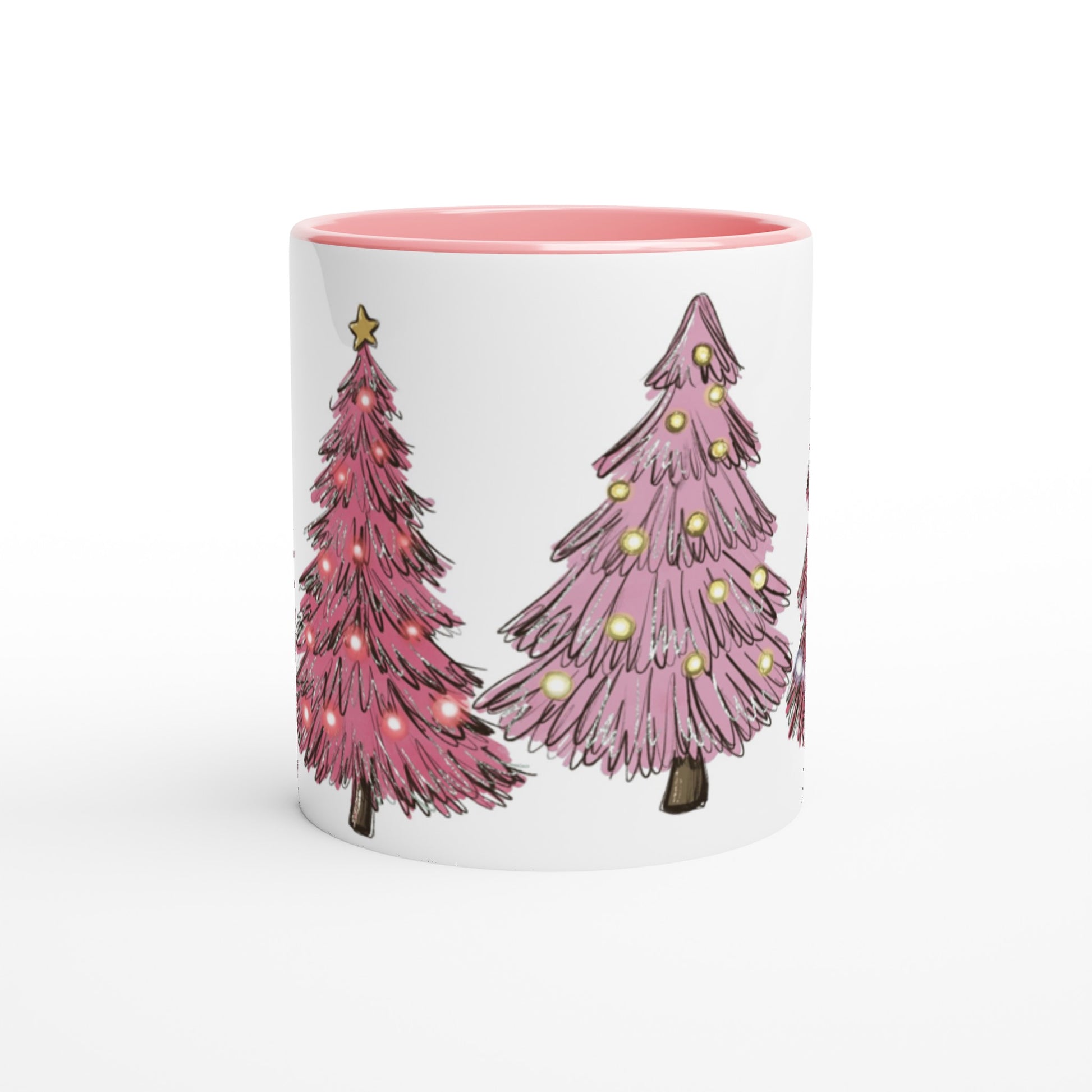 Pink Christmas Trees on White 11oz Ceramic Mug with Color Inside